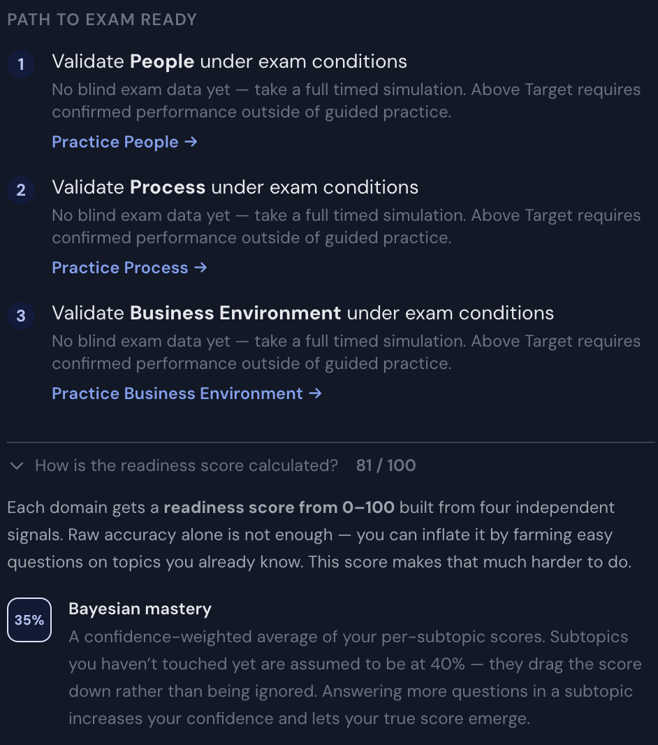 Approaching Ready means every domain has cleared the Target threshold (70%+), but hasn't yet been validated under timed exam conditions. That gap — between solid guided practice and confirmed performance under pressure — is where most candidates are when they think they're done studying.